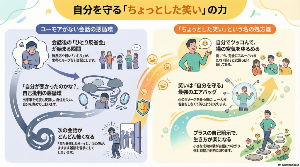 会話のあと、ひとり反省会をしてしまう人へ。ちょっとした笑い・ユーモアがあなたを守ります